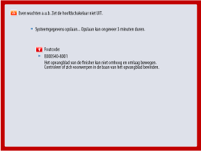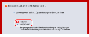 Afhankelijk van de fout kan er een bericht verschijnen waarin u wordt gevraagd de stroom van de machine niet uit te schakelen, omdat de machine de systeeminformatie opslaat nadat de fout is opgetreden. Schakel in dit geval de machine niet uit totdat de gegevens zijn opgeslagen.