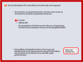 Als [Modus beperkte functies] op het scherm verschijnt, kunt u hierop drukken en de machine blijven gebruiken voordat u het probleem oplost. De bruikbare functies zijn echter beperkt.