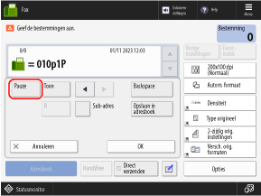 klik op [Settings/Registration] [Send] [TX Settings - Fax Settings] voer in [Set Pause Time] de pauzetijd in klik op [OK] |