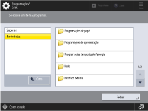 Programações/Grav.] no painel de controlo. Utilize este ecrã para configurar as várias definições da máquina.