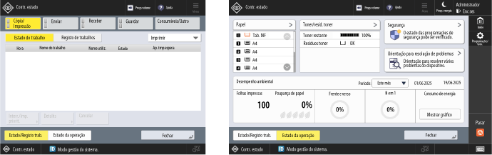 Pode selecionar [Estado/Registo trab.] para verificar o estado do processamento e o histórico de cada função e a quantidade restante de consumíveis e peças.