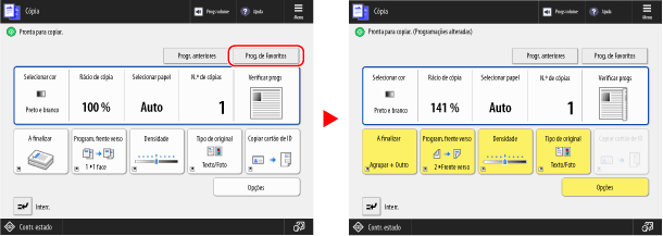 Pode recuperar programações registadas dos ecrãs de função para executar rapidamente uma função. Também pode alterar as definições depois de aceder às mesmas, conforme for necessário.
