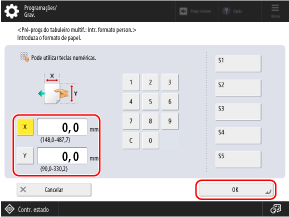Dependendo da orientação e do formato dos envelopes, [Seguinte] pode aparecer. Pressione [Seguinte], insira o comprimento da aba ou tamanho (comprimento do lado) dos envelopes e, em seguida, pressione [OK].