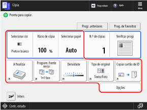 O ecrã de cópia é exibido quando pressiona [Cópia] no ecrã [Início] do painel de controlo.