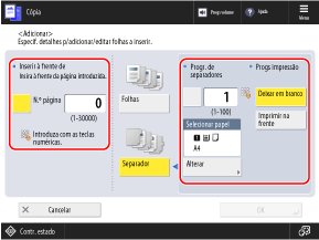 Prima o botão [N.º página] para selecioná-lo e especifique o número da página onde os separadores serão inseridos, utilizando as teclas numéricas.