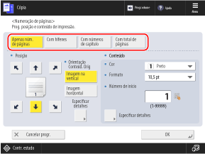 * Não pode selecionar [Superfície total] e [Números em 5 locais] se as configurações estiverem configuradas para adicionar outras informações aos números do conjunto de cópias.