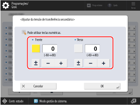 Se a imagem geral impressa tiver uma cor mais clara ou distorcida em comparação com quando é impressa em papel normal, pode ajustar a tensão de transferência secundária (tensão quando a imagem é transferida para o papel) para o papel personalizado registado.