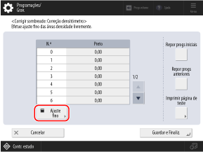 Meça a página de teste impressa com um densitómetro comercial e insira os valores de densidade medidos para fazer correções de modo a que a densidade das áreas de meio-tom seja uniforme.