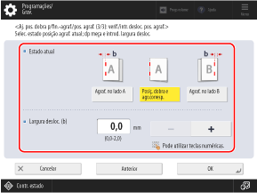 Para [Alt. posição dobra/fin-ag.], pressione [+] para mover a posição da lombada para a direita do lado de impressão e pressione [-] para mover a posição da lombada para a esquerda do lado de impressão.
