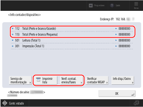 Pode exibir os contadores e verificar os números de páginas impressas e copiadas e os números das páginas digitalizadas e enviadas e das páginas enviadas por fax até o momento.