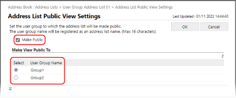 Selecione a caixa de seleção [Make Public] e selecione o grupo de utilizadores para o qual a lista de endereços é tornada pública.