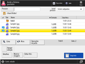No painel de controlo, prima [Aceder a ficheiros guardados] na janela [Início] e selecione um espaço de armazenamento para exibir a tela de seleção de ficheiros.