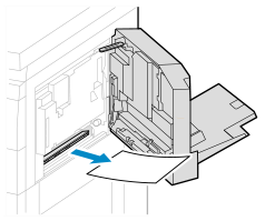 Se o papel estiver encravado no tabuleiro multifunções puxe-o cuidadosamente na direção da seta.