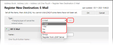 В разделе [Type] выберите [Register from LDAP Server] и щелкните [Set].