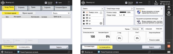 Можно выбрать [Состояние/журн. заданий] для проверки состояния обработки и истории каждой функции, а также оставшегося количества расходных материалов и компонентов.
