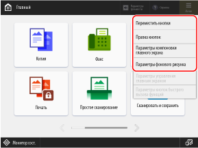 Вы можете изменять расположение кнопок функций и настроек на экране [Главный], а также заменять фон на любое из предварительно установленных изображений.