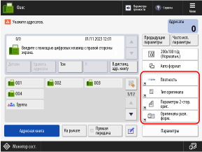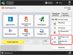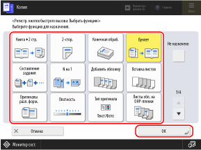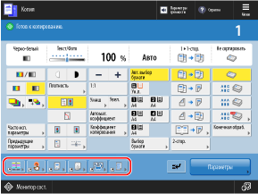 Можно заменить следующие кнопки, отображаемые на экранах сканирования (Сканировать и отправить), факса и копирования, кнопками в меню [Параметры] и скрыть эти кнопки.