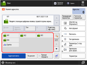 Чтобы указать адресатов из адресной книги, нужно вызвать адресную книгу с экрана сканирования (Сканировать и отправить) или отправки факса панели управления.
