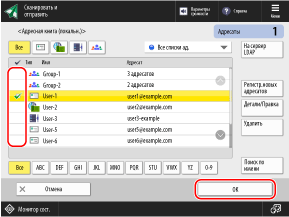 При использовании экрана сканирования выберите кнопки адресатов, которых необходимо указать, и нажмите [OK].