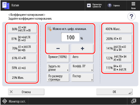 На экране копирования нажмите [Коэффициент копирования].
