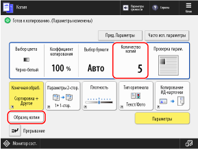 На экране копирования введите количество копий и нажмите [Образец копии].
