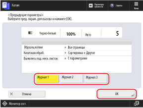 На экране [Предыдущие параметры] выберите историю, которую требуется вызвать, и нажмите [OK].