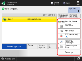 Вы можете нажать [Предыдущие параметры], чтобы вызвать параметры, которые использовались для отправки сканированных данных в прошлом. Вместе с вызываемыми параметрами также применяется выбор адресата для отправки.