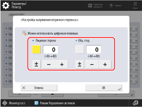 Если в целом напечатанное изображение светлее или искажено по сравнению с изображением при печати на обычной бумаге, вы можете отрегулировать напряжение вторичного переноса (напряжение при переносе изображения на бумагу) для зарегистрированной пользовательской бумаги.
