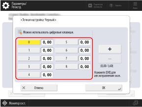 Измерьте образцы цвета 0–8 на пробной странице с помощью денситометра и введите измеренное значение плотности для каждого номера.