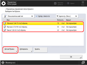 Выберите пользовательскую бумагу в списке и нажмите кнопку [Детали/Правка].