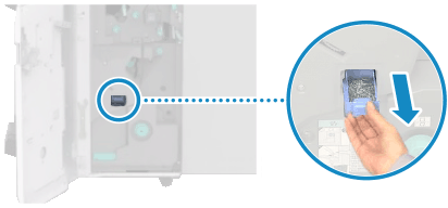 Поместите выступ на верхней части лотка для отходов скрепок в паз финишера и задвиньте лоток.