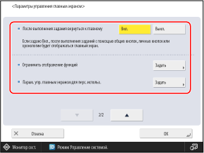 Установите для этого параметра значение [Вкл.], чтобы снова отобразить экран [Главный] после выполнения действий с использованием общей кнопки, личной кнопки или хронологии.