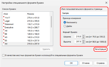Введите имя бумаги пользовательского формата и формат бумаги, затем щелкните [Регистрация].