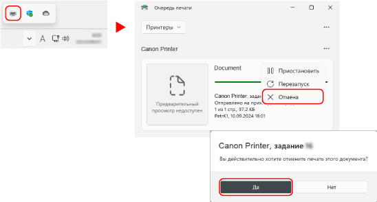 Если приведенный выше экран не отображается, дважды нажмите на значок принтера в области уведомлений Windows, выберите документ, печать которого следует отменить, нажмите правой кнопкой мыши [Отмена]