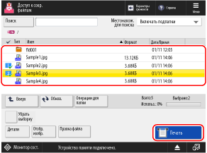 Можно напрямую распечатать файлы PDF, XPS, JPEG или TIFF, находящиеся на вставленном в аппарат запоминающем устройстве USB, с панели управления.