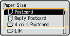 1 | Select the type of postcards. When printing on both sides of a postcard, print on one side first, then load the postcard in the multi-purpose tray again and print on the other side. If the postcard curls after printing on the first side, fix the curling before printing on the other side. |
