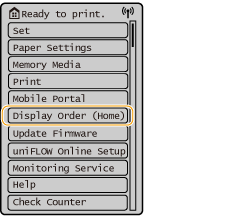 Select <Display Order (Home)> to customize the <Home> screen by rearranging the buttons. Customizing the Display