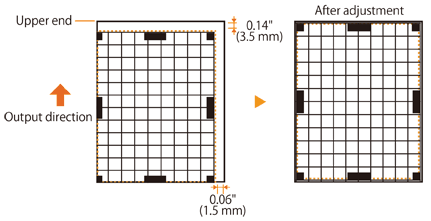 Adjust the print position after confirming the direction and distance for adjustment. The print position can be adjusted in the range -0.14" (-3.5 mm) to +0.14" (+3.5 mm) in both the horizontal and vertical directions, in 0.004" (0.1 mm) increments.
