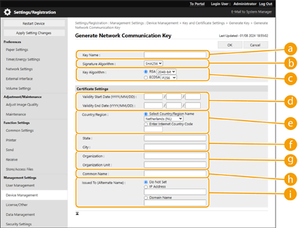 [Key Algorithm]Select [RSA] or [ECDSA] as the key generation algorithm. Select the key length if you selected [RSA] and the key type if you selected [ECDSA]. In both cases, a higher value provides greater security but reduces the communication processing speed.