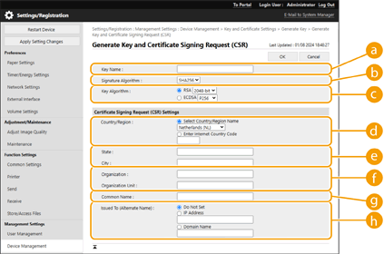 You can generate a key and CSR on the machine. You can also display the CSR data on the screen and export it as a file.