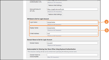 4 | Specify the attributes. ![]() Enter the attributes for the login name, display name, and e-mail address of each user account on the server. [Login Name:]From the pulldown menu, select the attribute for the login name of each user account on the server. * To specify an attribute not displayed in the pulldown menu, you can enter it directly. [WindowsLogonName]: displayName is obtained from Microsoft Entra ID. displayName is changed as follows to create the login name: Spaces and the following characters are deleted from displayName: * + , . / : ; < > = ? \ [ ] |. "@" and any subsequent characters are deleted. Character strings exceeding 20 characters are shortened to 20 characters or less. Example: When displayName is "user.001@example.com," the login name becomes "user001." [displayName]: displayName obtained from Microsoft Entra ID becomes the login name. [userPrincipalName]: userPrincipalName obtained from Microsoft Entra ID becomes the login name. [userPrincipalName-Prefix]: The portion before "@" in userPrincipalName obtained from Microsoft Entra ID becomes the login name. Example: When userPrincipalName is "user.002@mail.test," the login name becomes "user.002." [Display Name:] / [E-Mail Address:]Enter the attributes for the display name and e-mail address of each user account on the server. |