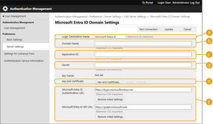 3 | Specify the Microsoft Entra ID information. ![]() [Login Destination Name:]Enter the name to be displayed at the login destination. * You cannot use control characters or spaces. [Domain Name:]Enter the domain name of the Microsoft Entra ID that is the login destination. [Application ID:]Enter the application (client) ID. [Secret:]Enter the secret generated by Microsoft Entra ID. You do not need to enter this when [Key and Certificate:] is used. [Key and Certificate:]Press [Key and Certificate] when you use a key and certificate. You can press [Export Certificate] to export the certificate to be registered to Microsoft Entra ID. [Microsoft Entra ID Authentication URL:] and [Microsoft Entra ID API URL:]Enter the URLs. Depending on your cloud environment, you may need to change the settings. |