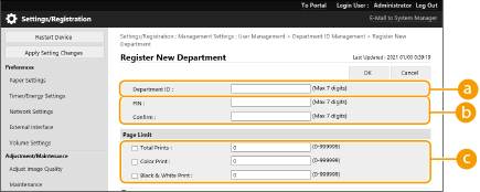 Department ID Management is only valid for users who are registered to the local device. If you login as a user with Administrator privileges, a System Manager ID and PIN are automatically assigned, and managed as Department ID. |