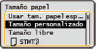 Si necesita cambiar frecuentemente el papel que se va a cargar, ajuste en <Tamaño libre>; esto reducirá el número de pasos necesarios para cambiar el ajuste. También puede visualizar un mensaje de error cuando la configuración del controlador de la impresora sea significativamente diferente al tamaño del papel cargado. <Dif. tam. pap. para origen pap. tam. lib>