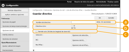 Gestionar directivas IPSecPuede editar las directivas en la pantalla que aparece en el paso 4. Para editar los detalles de una política, haga clic en el nombre de la política en la lista. Para deshabilitar una política, haga clic en el nombre de la política en la lista seleccione [No] para [Directiva sí/no] haga clic en [Aceptar].Para eliminar una política, selecciónela en la lista haga clic en [Eliminar] [Aceptar].Uso del panel de controlTambién puede activar o desactivar la comunicación IPSec desde <Establecer> en la pantalla <Inicio>. <Opciones de IPSec> Importación por lotes/Exportación por lotesEsta opción puede importarse/exportarse con modelos que admitan la importación de lotes de esta opción. Importación/exportación de datos de configuración Esta opción se incluye en [Información básica de configuración] en las exportaciones por lotes. Importar/exportar todas las opciones |