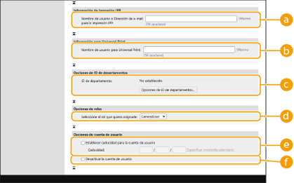 [Opciones de impresión IPP], podrá introducir la dirección de correo electrónico o el nombre de usuario usados en el usuario al que están asociados los trabajos de Impresión IPP.