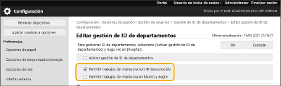 Seleccione esta casilla de verificación para aceptar trabajos de impresión y trabajos de impresión en blanco y negro desde los controladores de la impresora no compatibles con la Gestión de ID de departamentos.