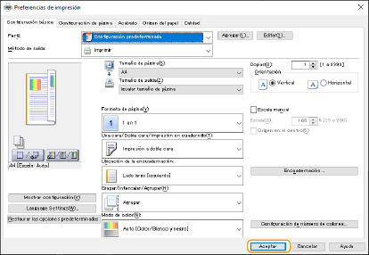 Especifique las opciones de impresión según sea necesario y haga clic en [Aceptar].