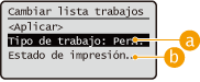 Seleccione el estado de trabajo que se muestra en la lista desde <Trabajos imprimir> y <Trabajos impresos>.