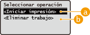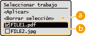 Cuando seleccione <Aplicar> en la pantalla <Cambiar lista trabajos>, podrá seleccionar documentos en la pantalla <Seleccionar trabajo>. Podrá imprimir o eliminar los documentos seleccionados.
